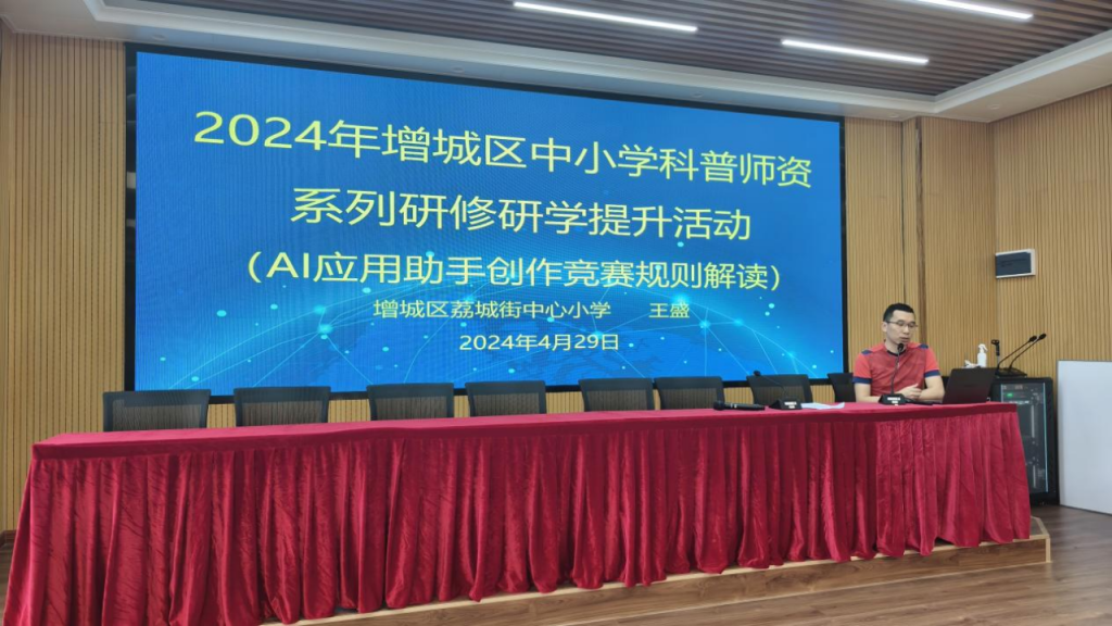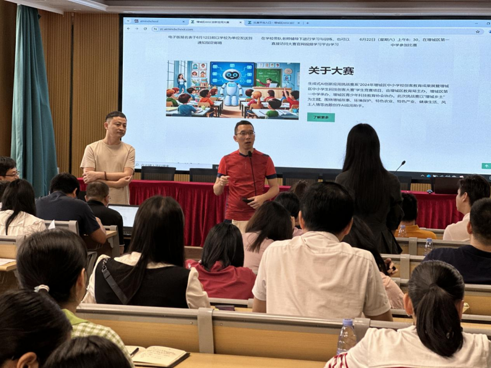 活动首先由王盛老师对人工智能部分作了介绍,生成式AI创新应用挑战赛作为2024年增城区中小学校创客教育成果展暨增城区中小学生科技创客大赛的四大学生赛项之一,既紧贴时代热点,又是师生急需掌握的重要技能。王老师通过对AI应用助手创作竞赛规则的详细解读,引导参训老师进一步明确增城乡土创作主题,以及挑战赛的报名及参赛方式。